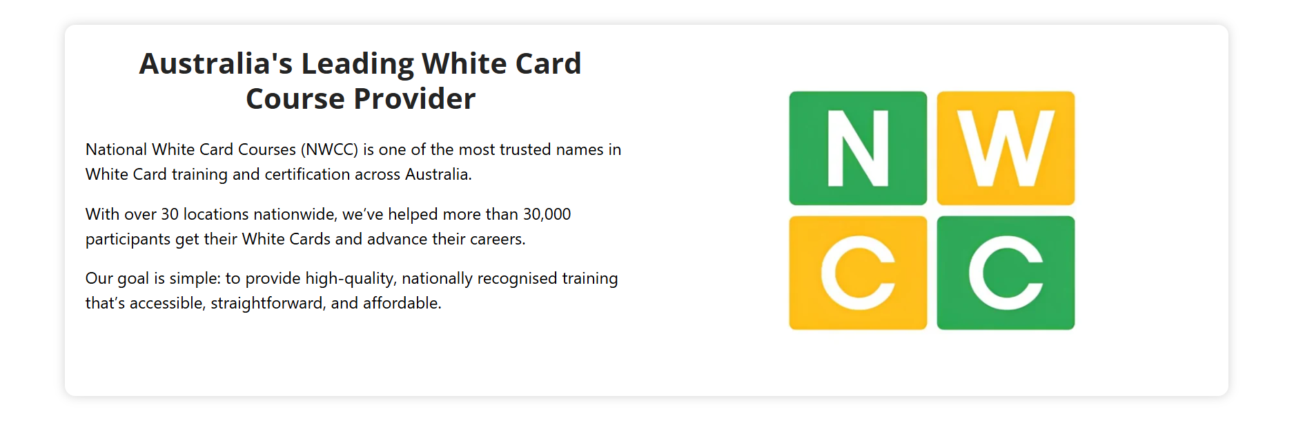 National White Card Courses is an accredited Registered Training Organisation (RTO 41072) providing nationally recognised White Card courses in Australia.