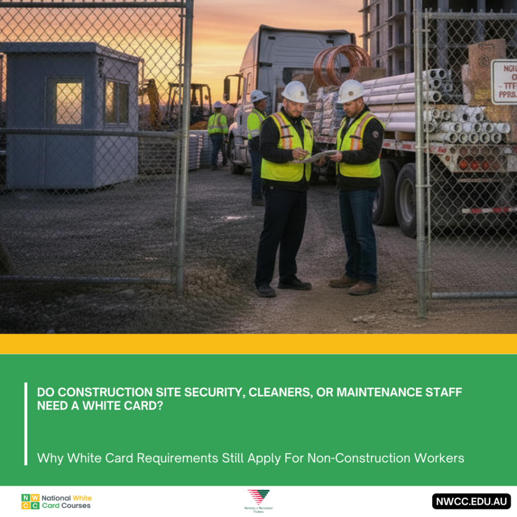 No. Construction hazards often remain present outside standard working hours. If a site is still classified as an active construction workplace, a White Card is usually required even for after-hours security, cleaning, or maintenance work.